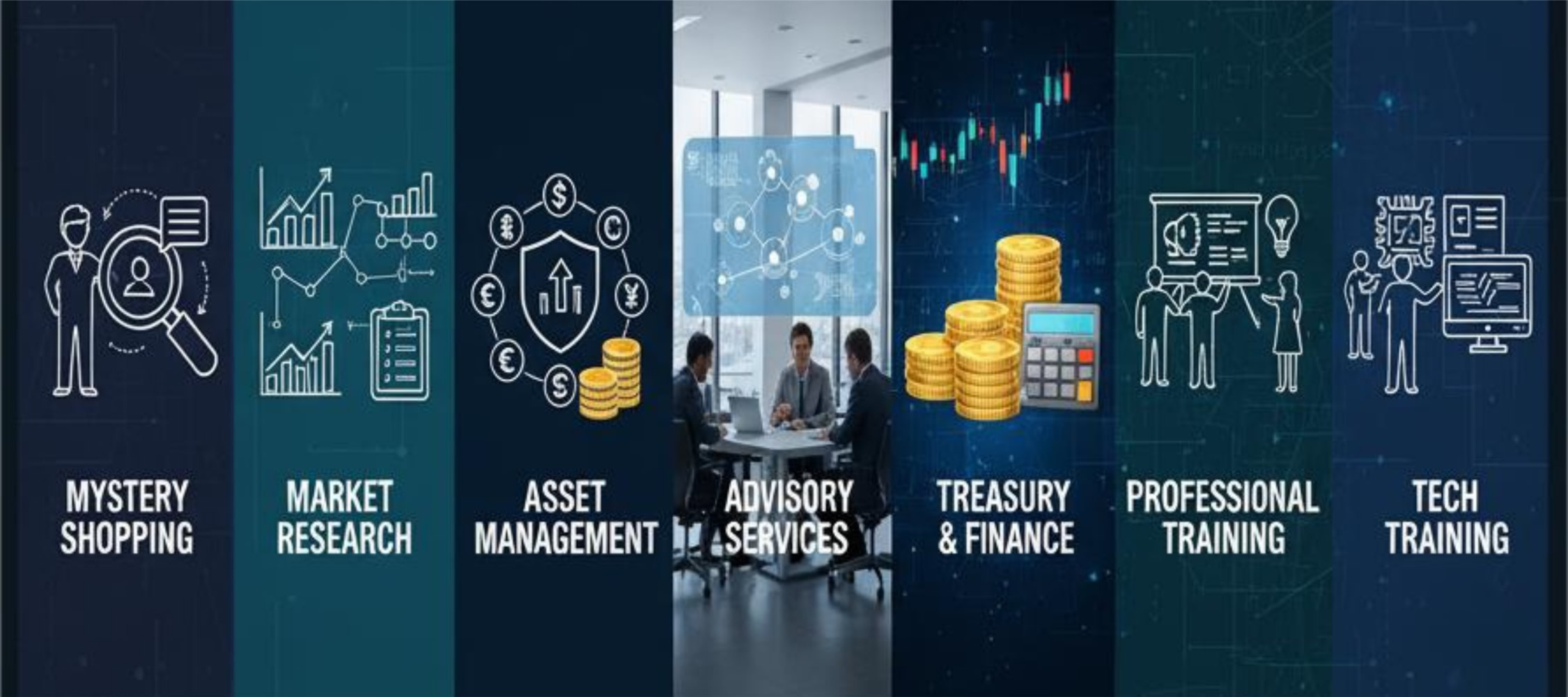 Our expertise spans Asset Management, Mystery Shopping, Market Research, Professional Training, and Financial Advisory Services.